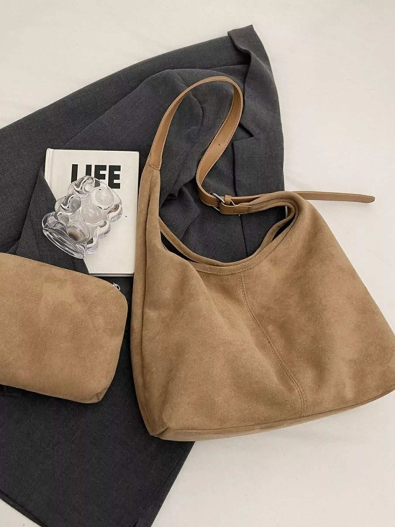 Een verfijnde handtas van medium formaat, gemaakt van zacht suède met een luxe uitstraling en tijdloze vorm. Perfect voor dagelijks gebruik dankzij de combinatie van stijl en functionaliteit.
