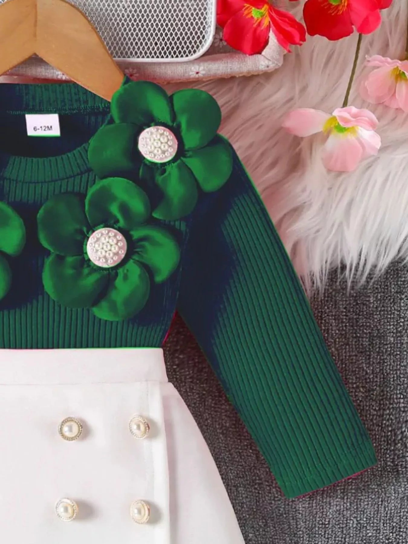 Bloemenapplicatie Geribbelde Top & Rok met Knopen Set