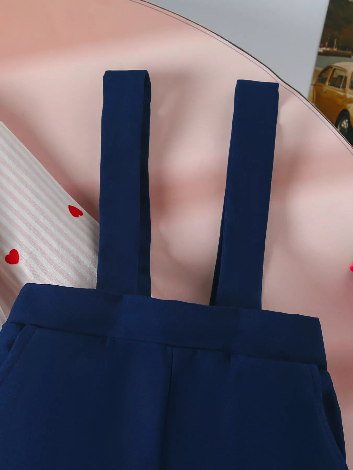 Een schattige tweedelige set met een hartjesromper en bretelbroek, afgewerkt met een strikdetail. Comfortabel, zacht en ideaal voor dagelijks gebruik.