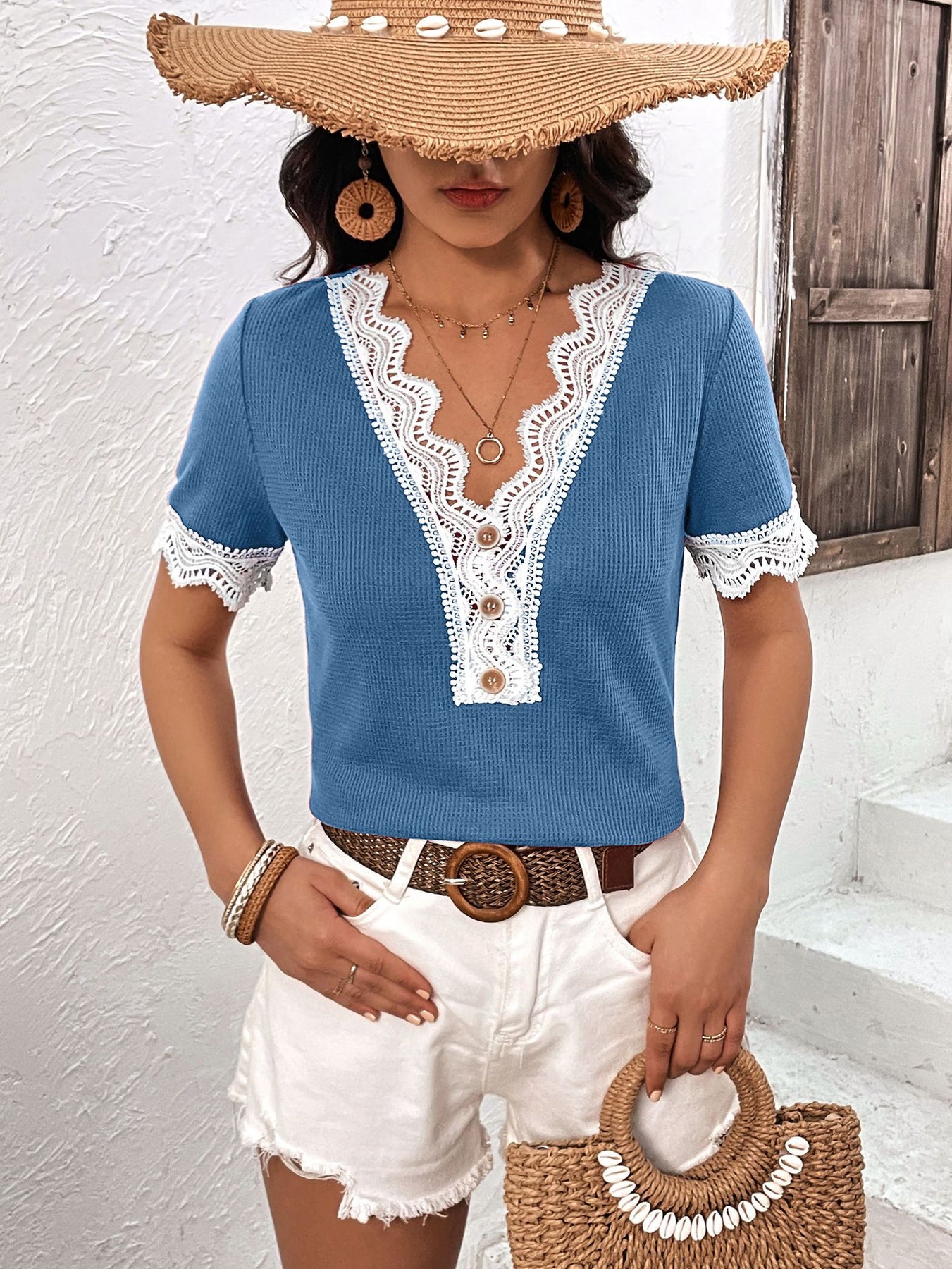 Kanten Top met Decoratieve Knopen en Korte Mouwen
