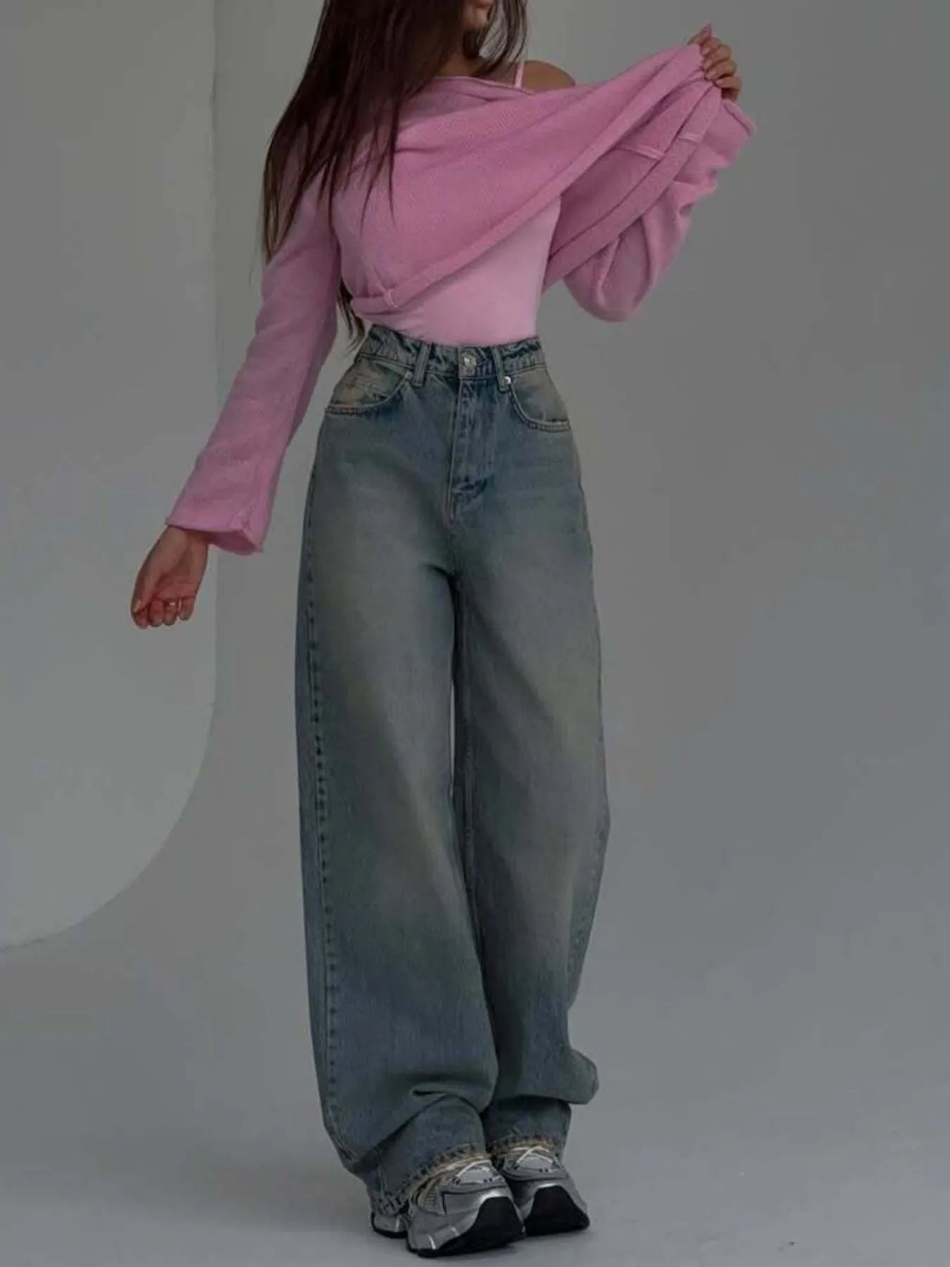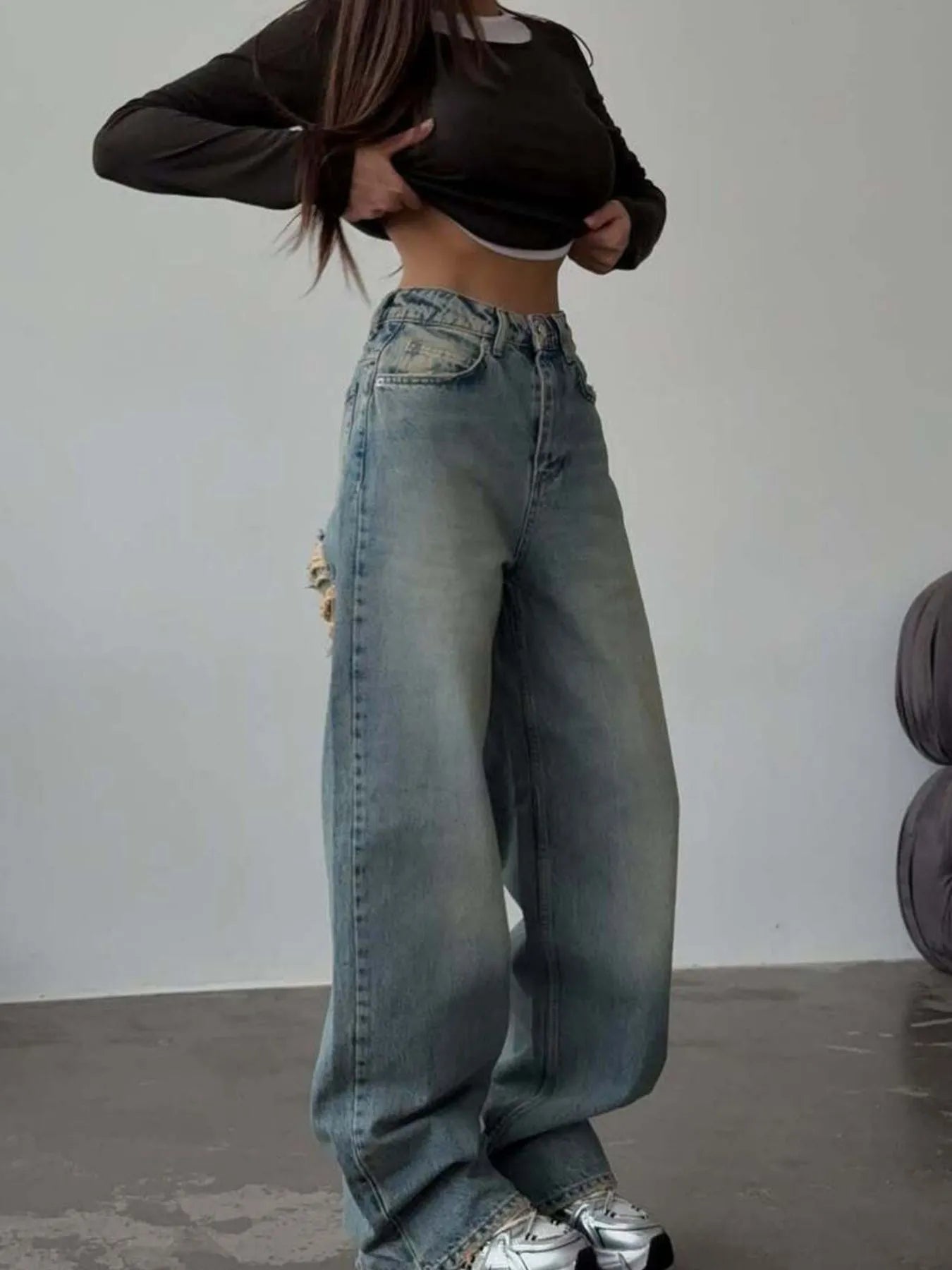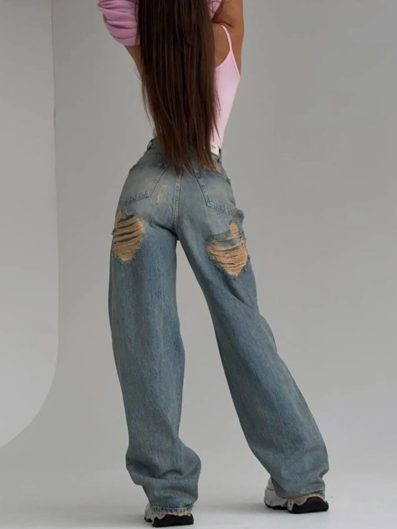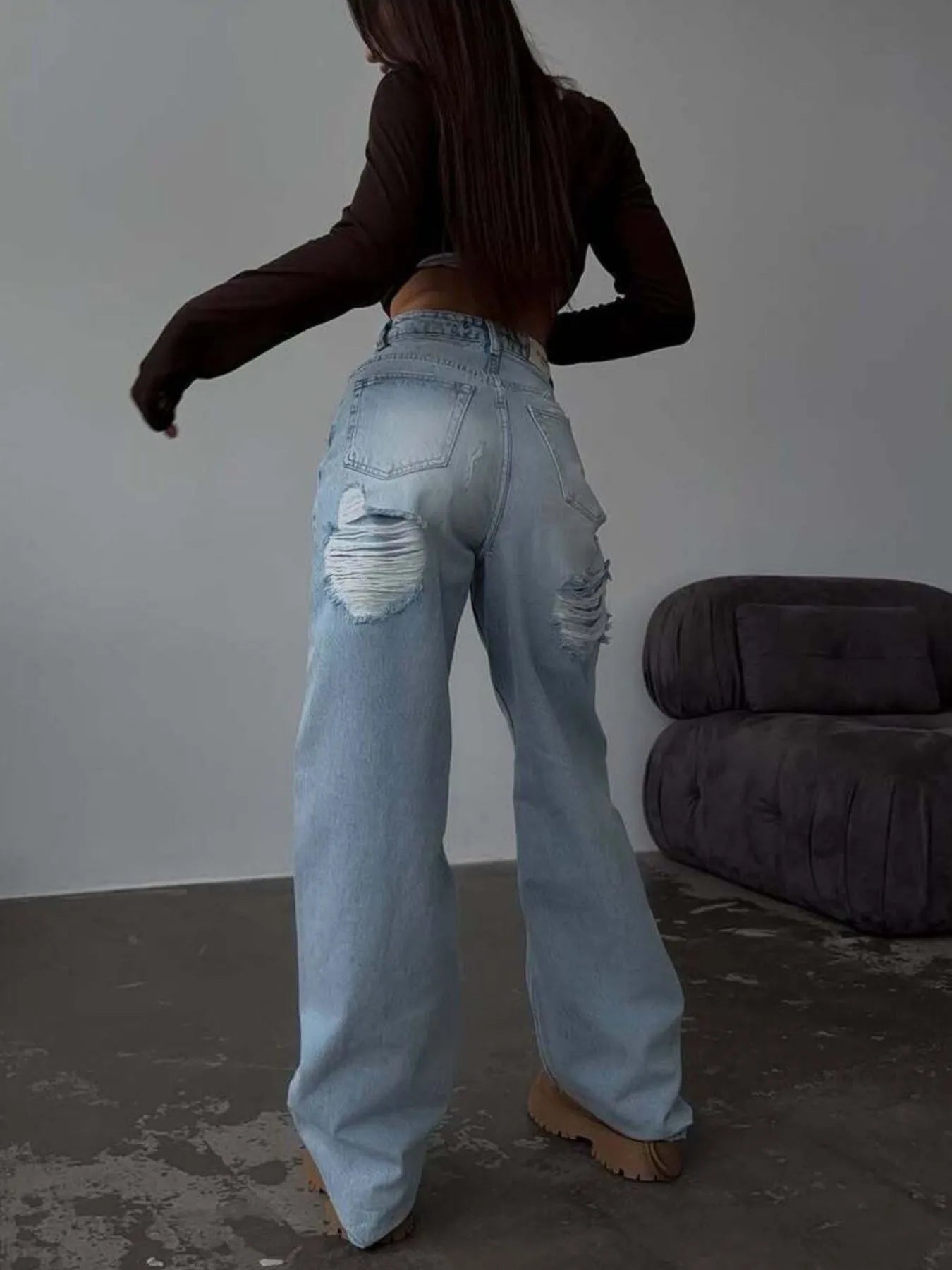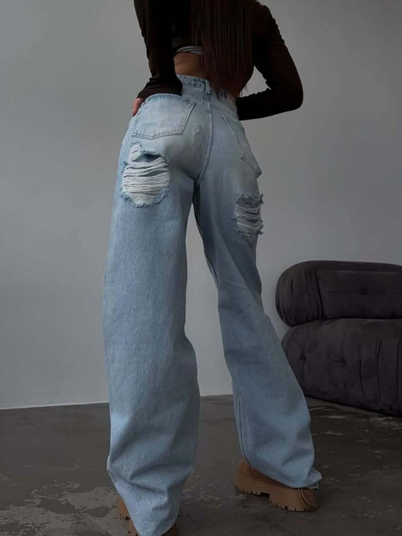 High-Waist Wijde Pijp Jeans met Gescheurde Details