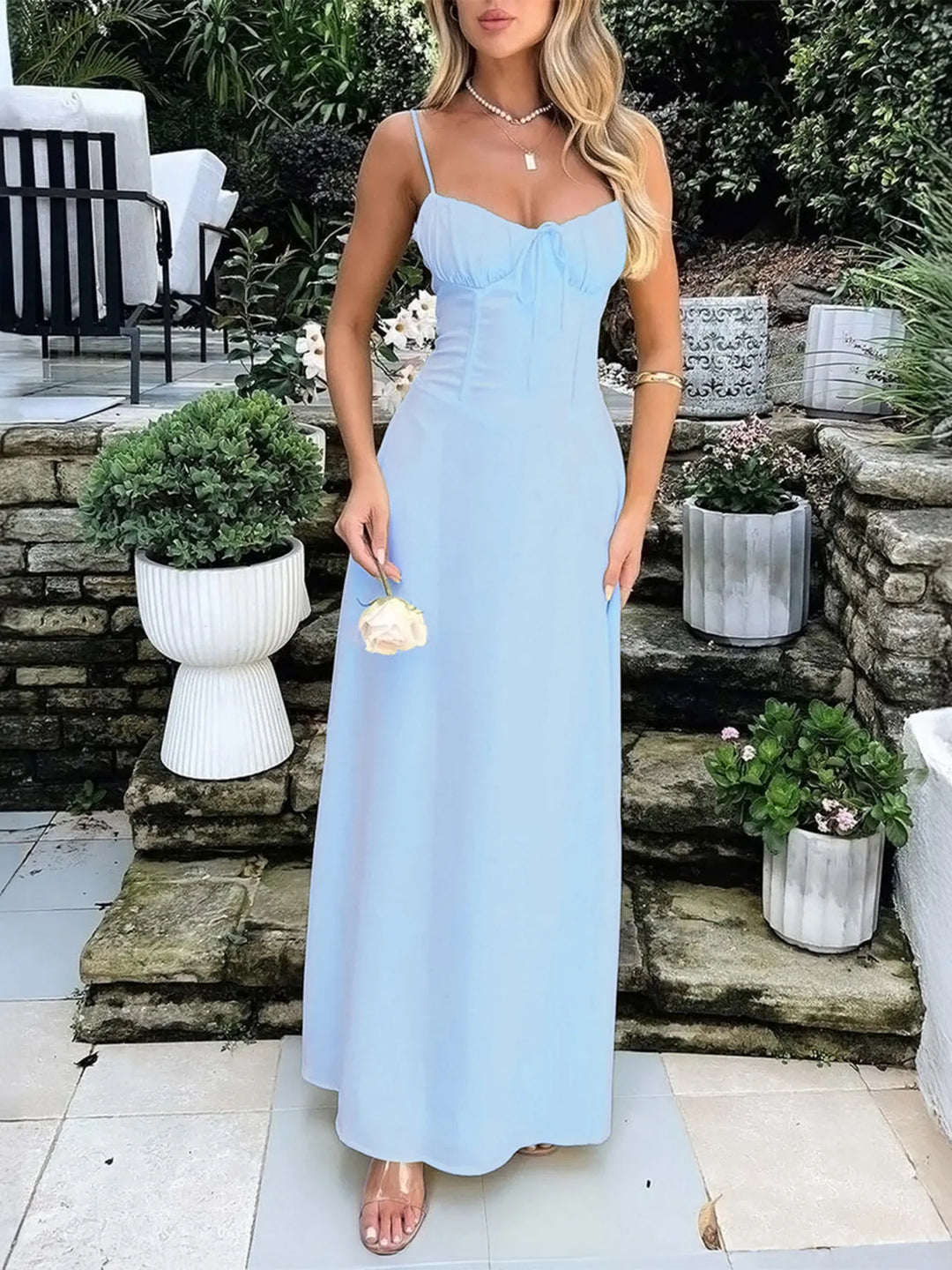 Een opvallende maxi-jurk met vetersluiting en strikaccenten voor een elegante maar gedurfde uitstraling. Ontworpen zonder stretch en gemaakt van een gladde polyester-elastaan mix die zowel structuur als comfort biedt. Perfect voor avonden, feestjes of iedere gelegenheid waarbij je wilt opvallen.