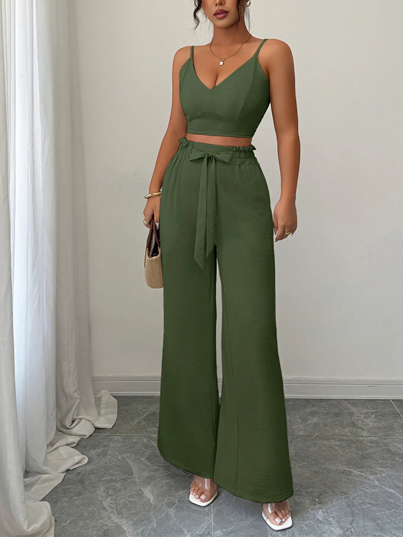 Deze vrouwelijke tweedelige set bestaat uit een gesmokte top met strikdetail en bijpassende broek met zakken. De lichte, licht rekbare stof biedt comfort en charme — perfect voor zomerse dagen, stranduitjes of ontspannen weekenden.