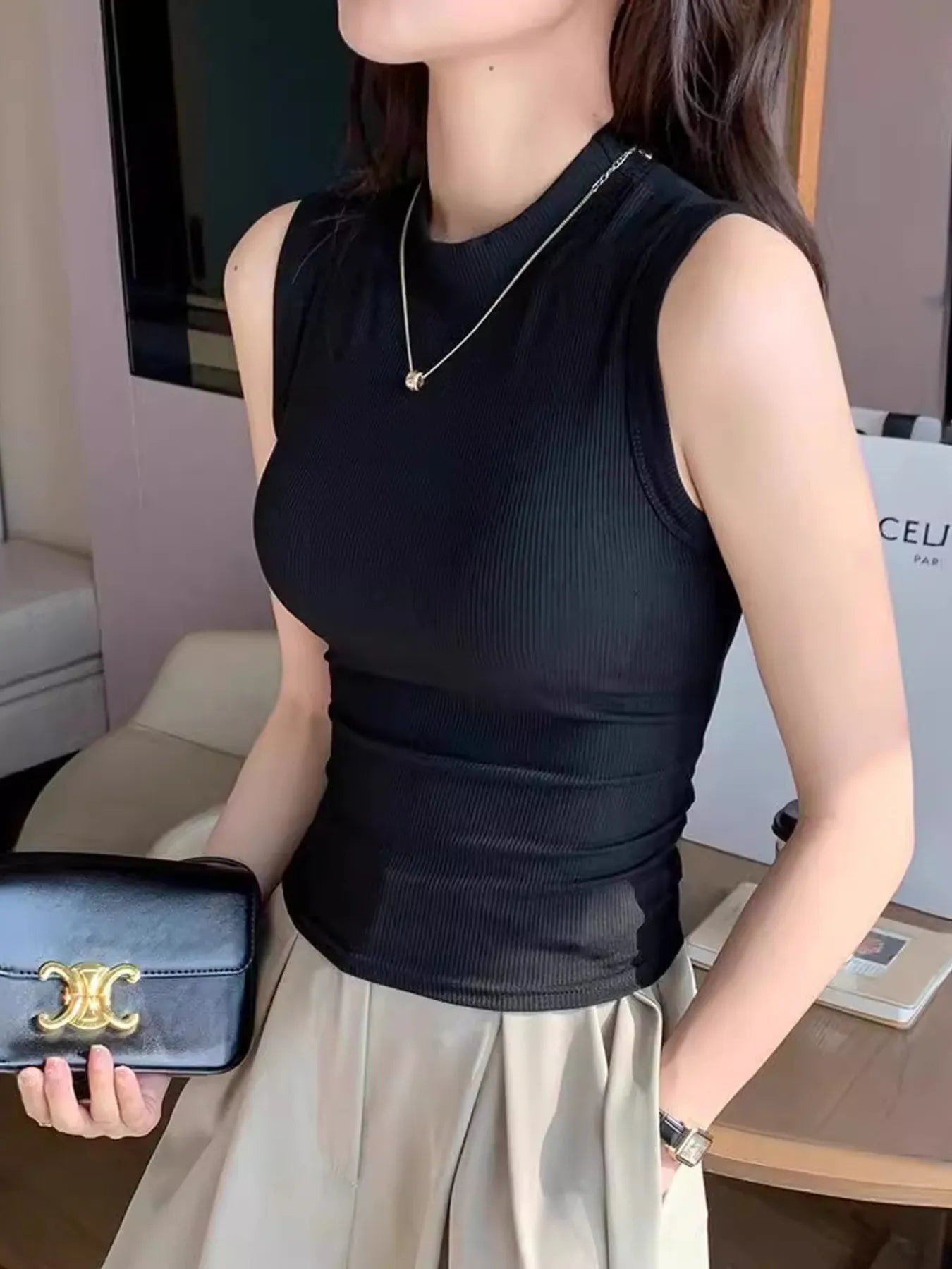 Modern en moeiteloos stijlvol — deze geribde top met hoge hals voegt een verfijnde touch toe aan je casual garderobe. Met een subtiele uitsnijding en een comfortabele stretch pasvorm combineert deze top minimalistische elegantie met een vleugje lef. Perfect om los te dragen of als laagje onder een blazer.